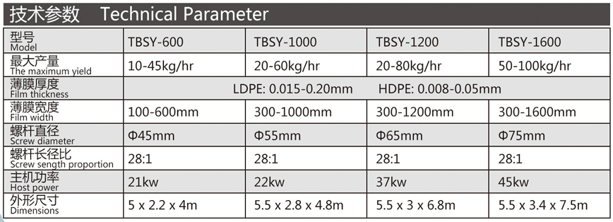 機(jī)器特性 吹制各種規(guī)格的低密度聚乙烯、高密度聚乙烯和線性低密度聚乙烯塑料薄膜,廣泛應(yīng)用于食品百貨、日用、化工、針紡品、購物禮袋和工業(yè)包裝。機(jī)筒、螺桿采用38CrMOAI合金材料經(jīng)氨化處理精密加工而成